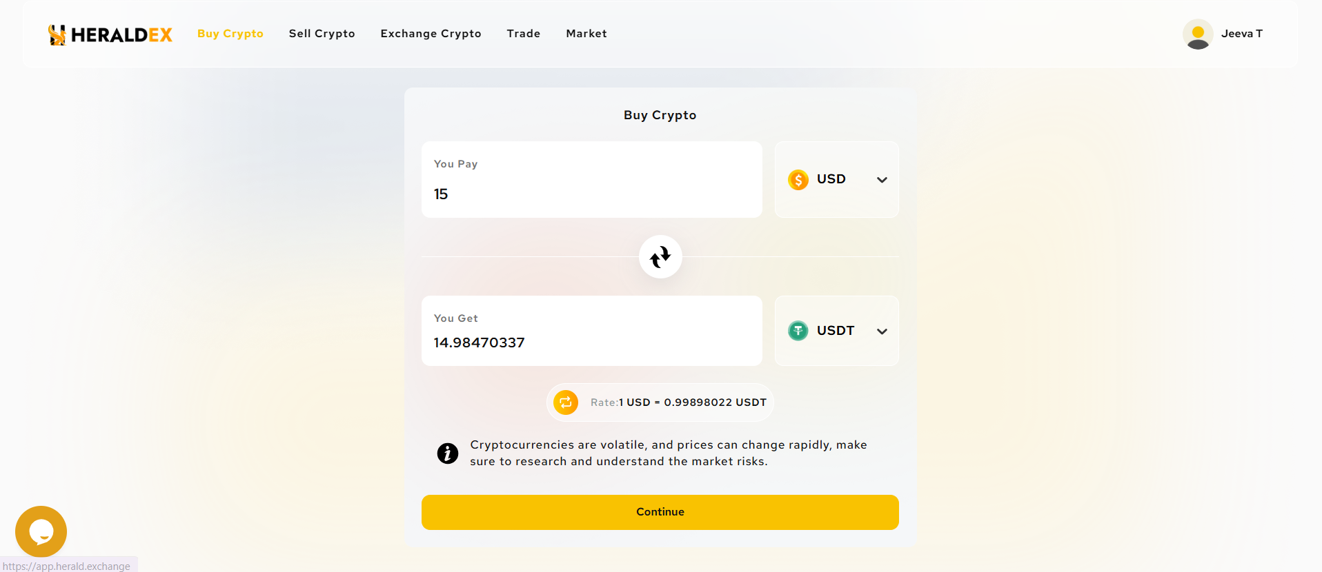 The Buy Crypto Page on HeraldEX provides a straightforward, transparent way for users to purchase cryptocurrency using fiat currencies like USD. The interface offers real-time exchange rates, flexibility in choosing how much to spend, and security features that ensure a smooth, efficient buying process. Whether you are a beginner or an experienced trader, HeraldEX’s user-centric design makes purchasing crypto fast and easy.