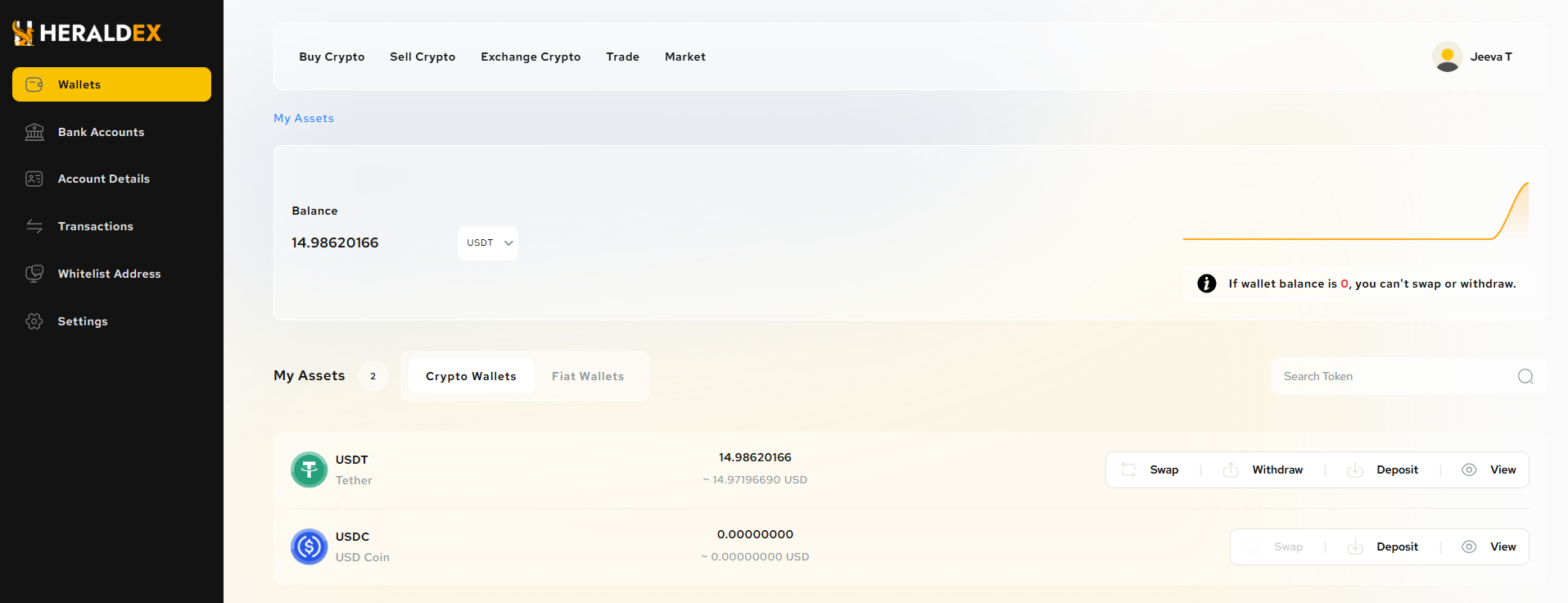 This section gives an overview of the user’s available balance for a specific token, in this case, USDT (Stable Coin).