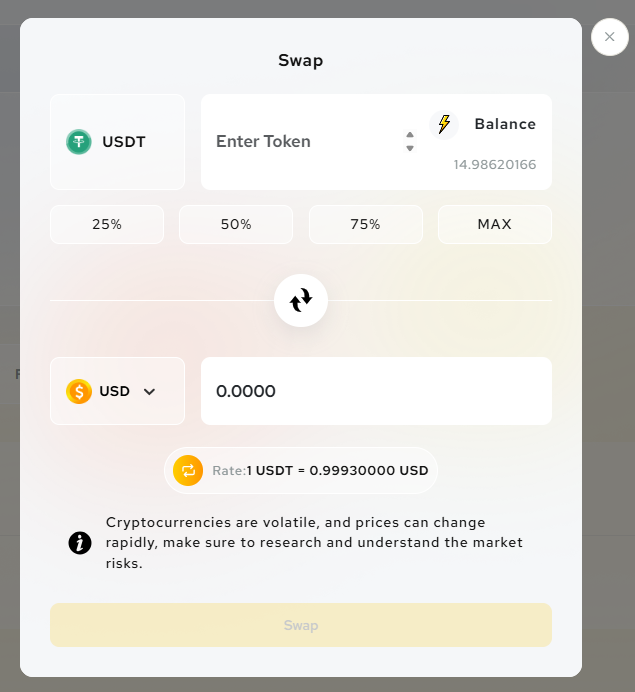- After the user has entered the amount and chosen the tokens for the swap, they can click the Swap button to initiate the transaction. This will deduct the specified amount of USDT from the user’s wallet and credit the equivalent amount of USD (or the chosen token) based on the current exchange rate.