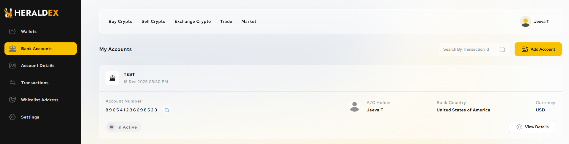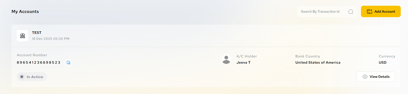 - Profile → Bank accounts → Add account → fill details → Create