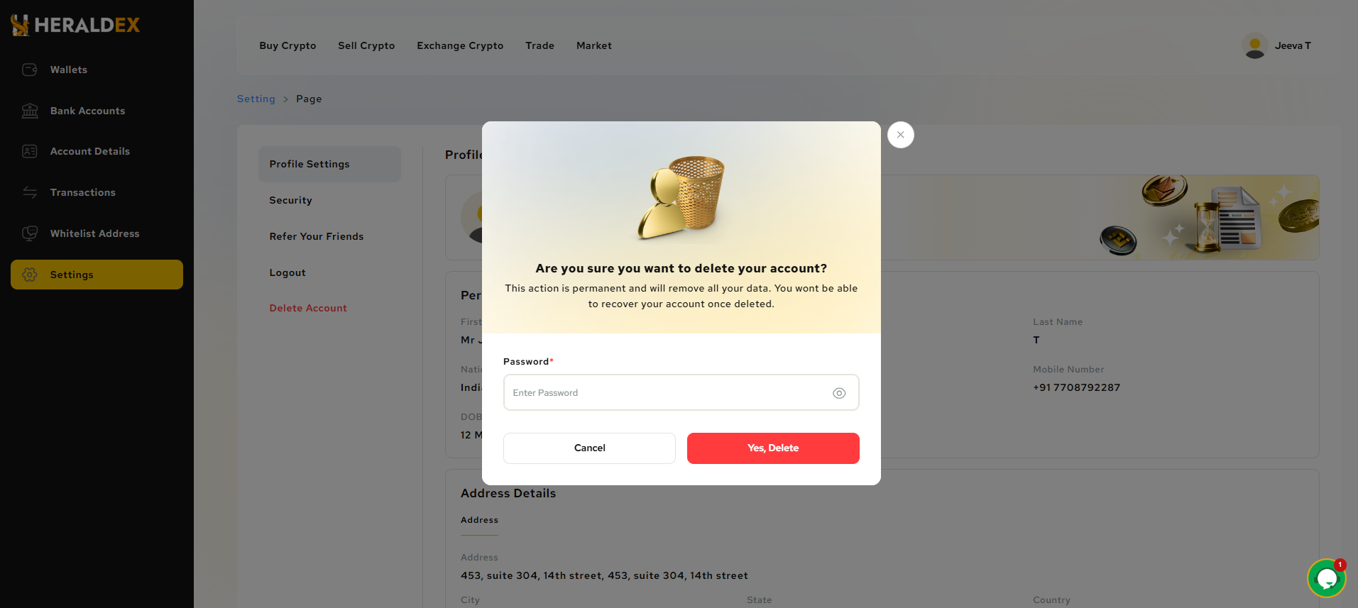 - Next, if the user clicks on delete account the second image pop-up will displayed. They have enter login password to delete the account permanently.